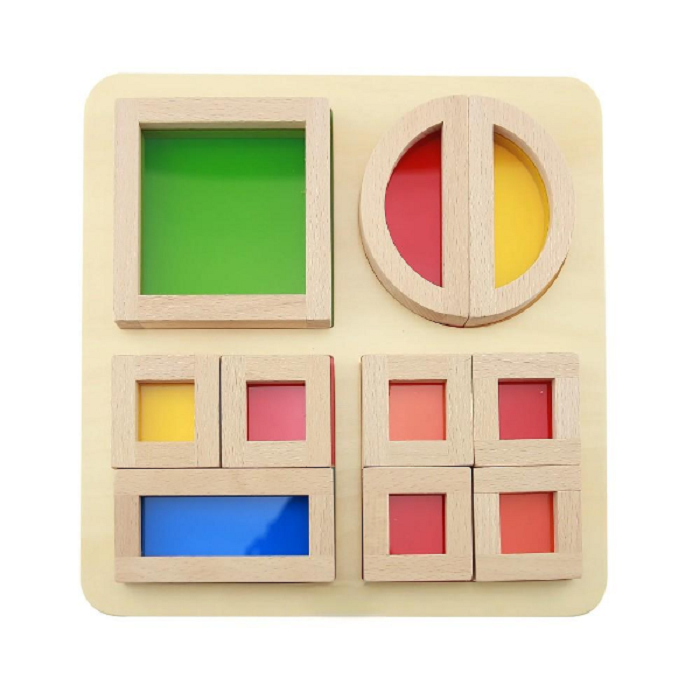 Панель с деревянными блоками разной формы с акриловыми вставками в различных прозрачных цветах. Используя своё воображение, дети могут создавать различные конструкции из блоков и смотреть на мир через блоки в разных цветах.