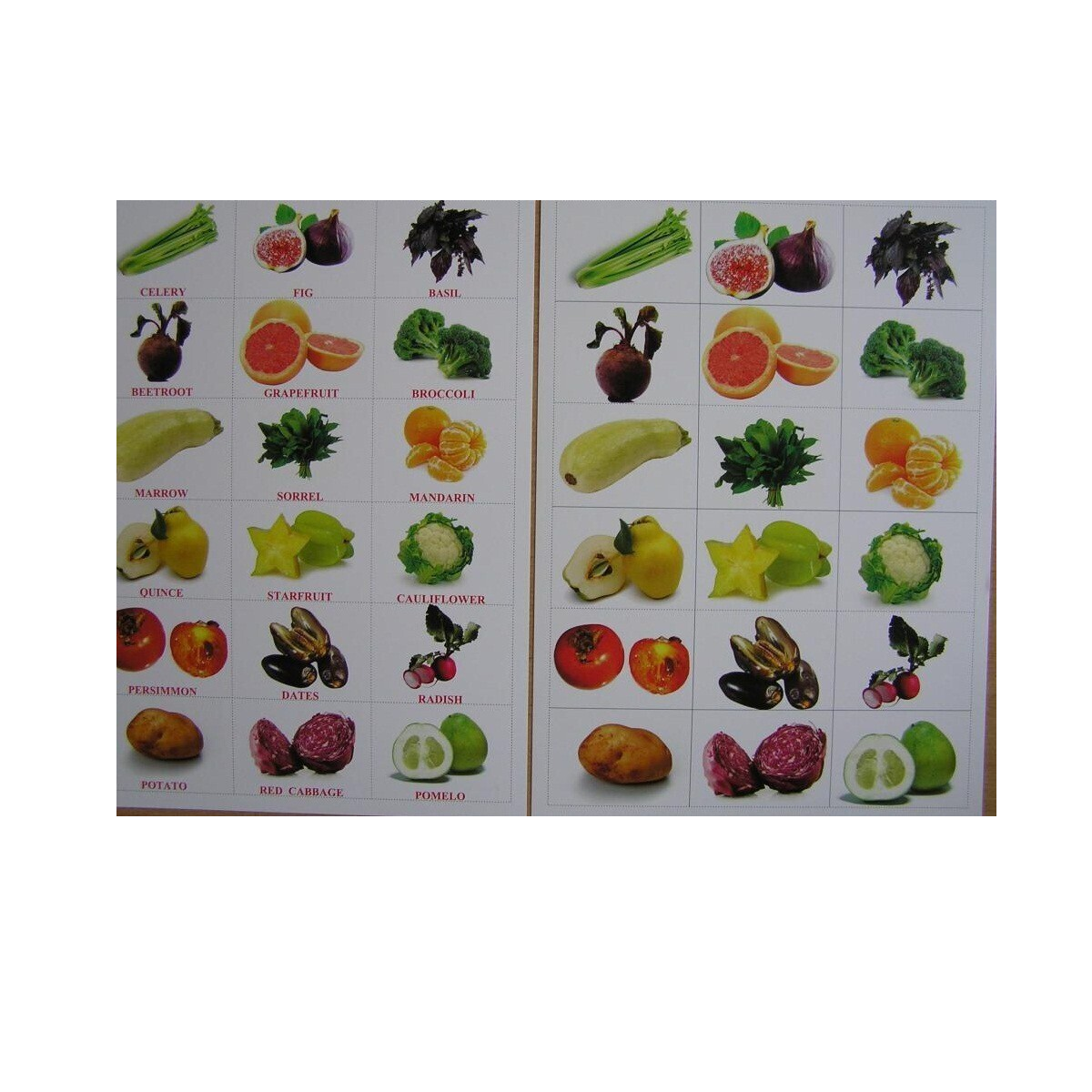 Перевод (на карточках перевод не указывается: Ананас, апельсин, абрикос, банан, груша, киви, лимон, яблоко, персик, слива, гранат, виноград, арбуз, дыня, инжир, грейпфрут, мандарин, айва, хурма, помело, лайм, манго, папайя,гуава, мангостин, дуриан, кумкват,фейхоа, маракуйя, личи, питахайя, карамбола, кокос, авокадо, финики, гранадилла, лук, морковь, огурец, помидор, тыква, репа, чеснок, перец болгарский, баклажан, горох, салат, зеленый лук, редька, капуста белокочанная, спаржа, сельдерей, брокколи, кабачок, щавель, картофель, капуста брюссельская, цуккини, патиссон, кукуруза, имбирь, артишок, фасоль стручковая, петрушка, укроп, базилик, цветная капуста, краснокочанная капуста, редис, свекла, черри, перец чили.