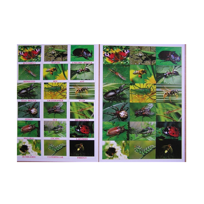 Состав: Butterfly, mantis, unicorn beetle, stag beetle, mosquito, grasshopper, ant, fly, wasp, spider, bee, dragonfly, caterpillar, may-bug, cicada, ladybird, bumblebee, firefly.