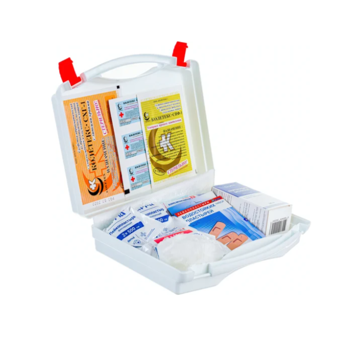 Аптечка для учебных, общеобразовательных учреждений футляр ФЭСТ 8М включает в себя большое количество салфеток, марлей и бинтов для остановки кровотечений.
