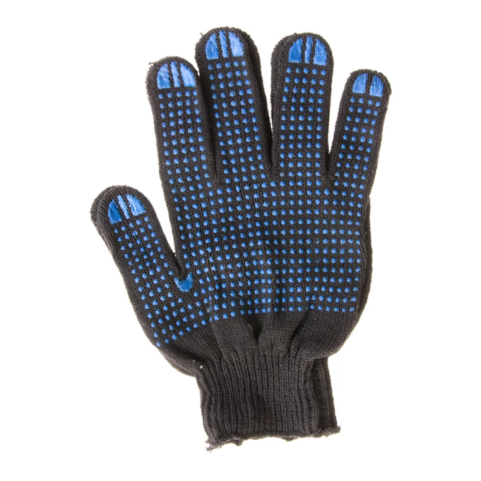 Черные трикотажные перчатки с ПВХ-покрытием «Точка», 10 класса вязки, защищают руки от царапин, порезов, ссадин, мозолей и загрязнений. Тонкая пряжа обеспечивает пальцам чувствительность, поэтому перчатки подходят для выполнения точных работ.