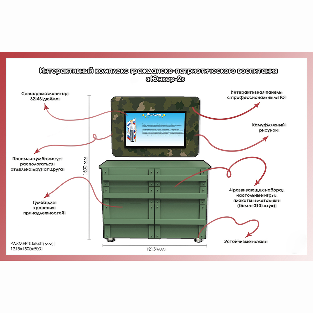 Интерактивный комплекс гражданско-патриотического воспитания «Юнкер-2» - это инновационный интерактивный комплекс гражданско-патриотического воспитания. Он подходит для использования в учебных заведениях, чтобы проводить занятия по начальной военной подготовке и патриотическому воспитанию.