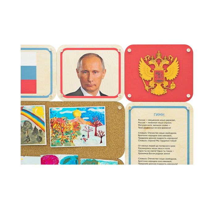 Акриловые рамки служат для размещения полезной информации: портрет губернатора, герб и флаг региона, национальный праздник или историческая личность, которую изучают юные воспитанники. На пустой пробковой панели можно легко размещать работы детей или распечатанный наглядный материал к уроку.
