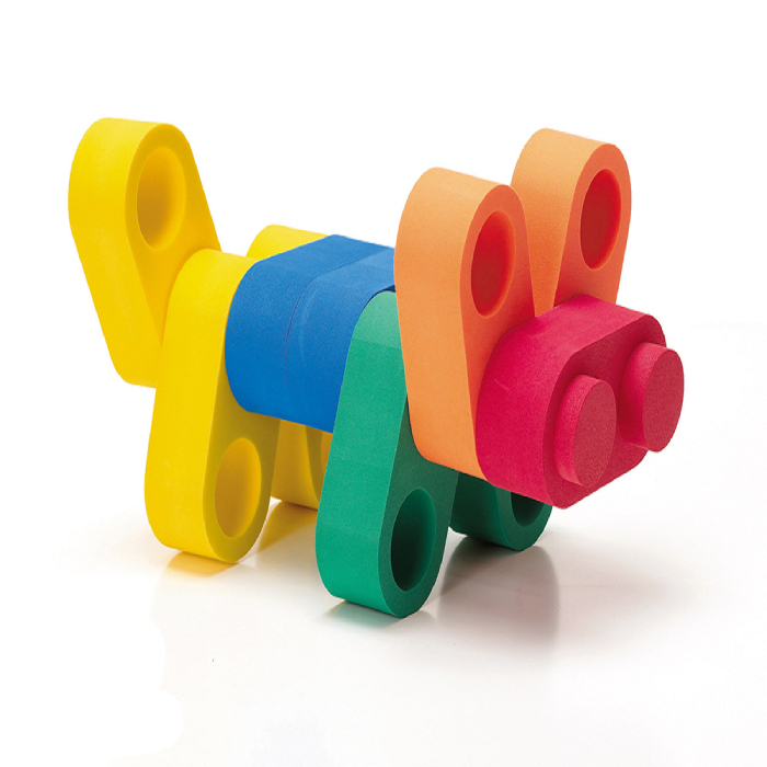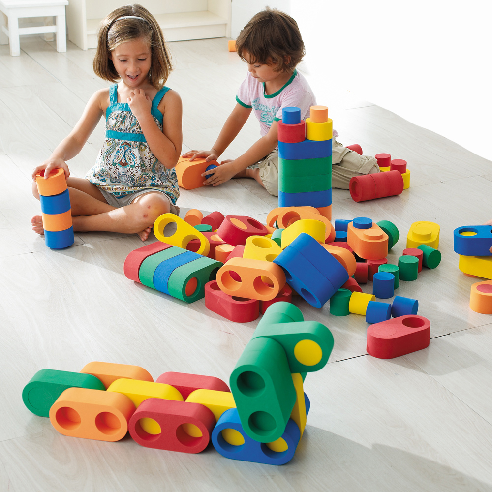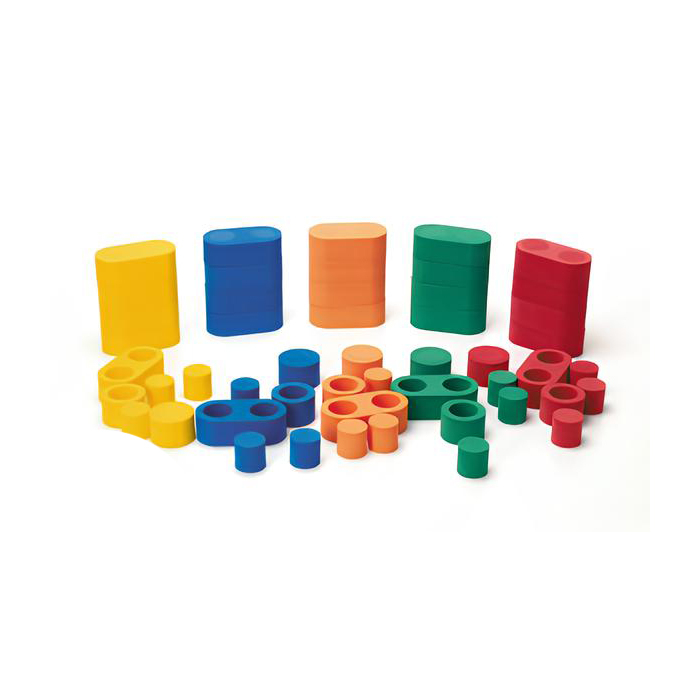 Детали конструктора очень легкие и мягкие, но соединения очень надежные. Элементы конструктора представляют собой цилиндры со сквозным отверстием в центре, объемные панели с двумя сквозными отверстиями. Детали представлены красного, желтого, зеленого, оранжевого, синего цветов. Предназначен для групповой и индивидуальной игры. Способствует развитию пространственного мышления, моторики, творческих способностей.