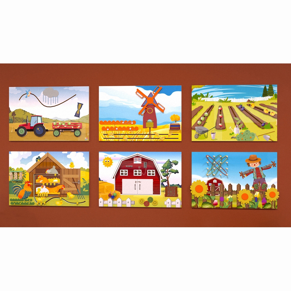Комплект настенных панелей «Ферма» состоит из 6 частей прямоугольной формы, которые выполнены в одном размере и оформлены в единой цветовой гамме. На каждой панели изображены разные части домашнего фермерского хозяйства. Безопасно крепятся к стене, покрытие панелей наивысшего качества обеспечит безопасность при игре.