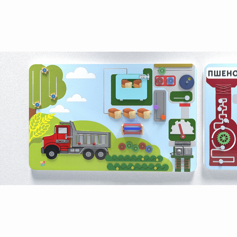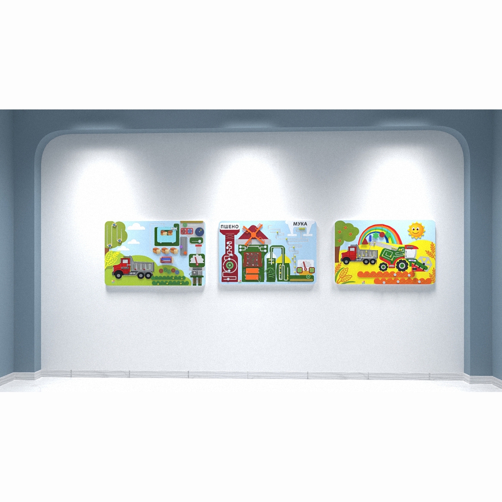 Комплект настенных панелей «Хлебокомбинат» отображает работу настоящего комбината по производству хлебопродуктов и все её этапы – от сбора урожая в поле до транспортировки готовой продукции в магазины. На панелях имеются и другие приспособления для развивающей детской игры.