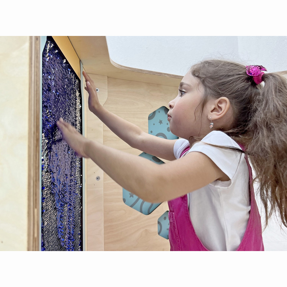 Внутри модули украшены тактильными панелями для развития сенсорной чувствительности, а снаружи – лазерной гравировкой и фигурными окошками. Они идеально стыкуются между собой и позволяют конструировать из них замки и лабиринты для маленьких непосед.