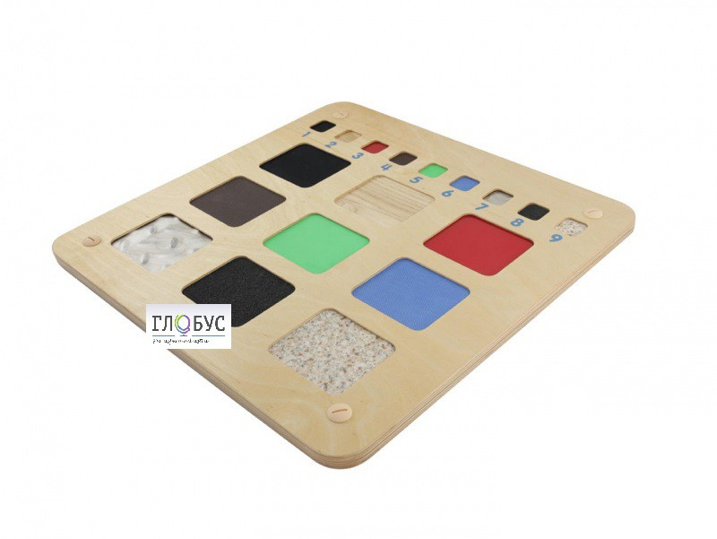 Настенная панель выполнена из березовой фанеры. На лицевой части в больших прямоугольных углублениях расположены 9 образцов различных материалов, для тренировки тактильных навыков. В верхней части панели расположены пронумерованные материалы, схожие с образцами. По углам панели размещены отверстия для крепления панели к стене.