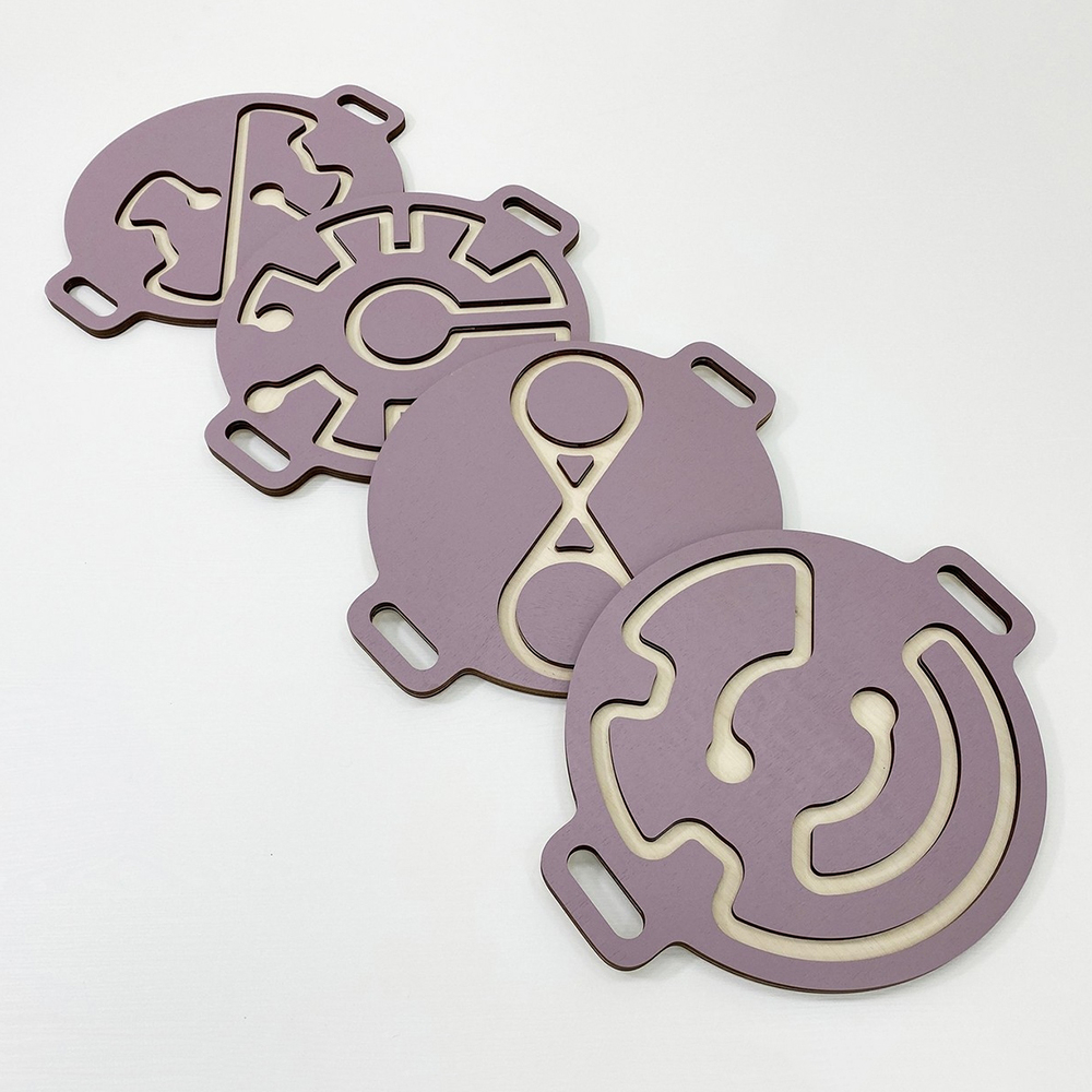 Благодаря заменяемости лабиринтов, игрушка просто универсальна! Дети могут играть отдельно с ручными лабиринтами или вставить их в балансир для ног и соревноваться в ловкости и скорости прохождения.