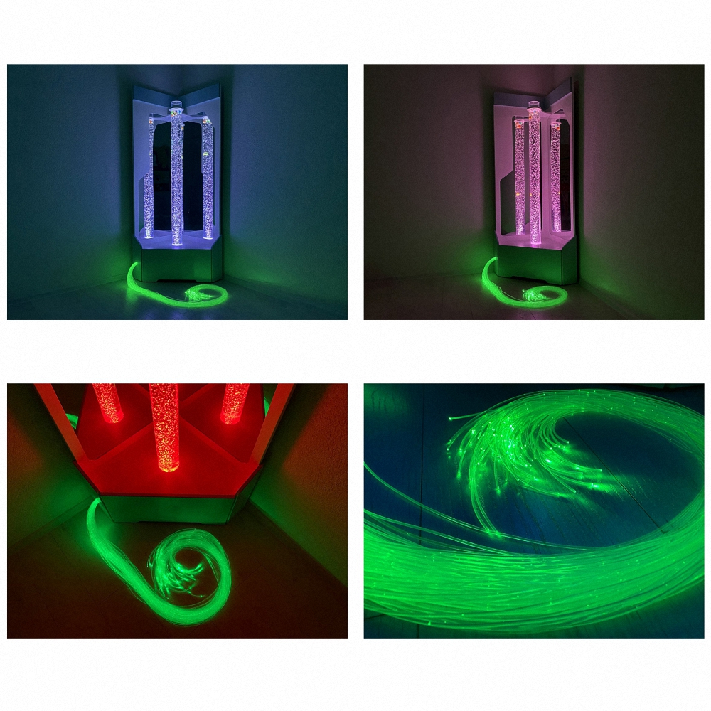 Угловая конструкция состоит из жёсткого основания, внутрь которого спрятан компрессор, подающий сжатый воздух, и открытой части с высоким воздушно-пузырьковым цилиндром и фонтаном из фибероптического волокна. Основание выполнено из экологичного МДФ и покрыто плёнкой ПВХ, устойчивой к повышенной влажности и ультрафиолетовым лучам. Такое покрытие не боится сколов, царапин, не выгорает на солнце и абсолютно безопасно для детей.