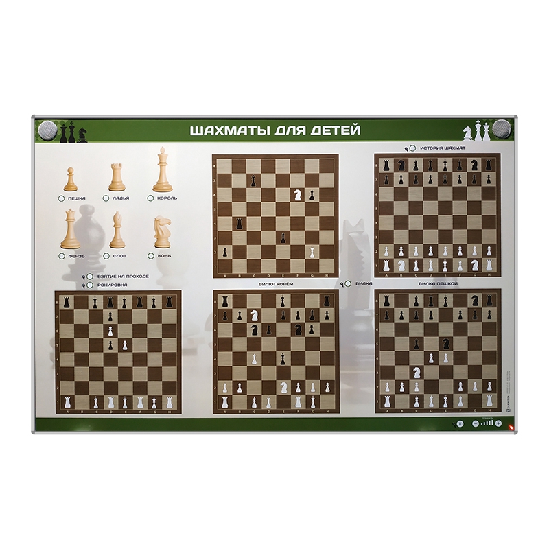 Электрифицированный стенд предназначен для первичного ознакомления детей с игрой в шахматы. На стенде отображены шахматные фигуры («Пешка», «Конь», «Ферзь», «Король», «Ладья», «Слон»). Основные возможности каждой фигуры поясняются посредством «Виртуального учителя». Также посредством «Виртуального учителя» рассказывается история шахмат и основные правили игры.